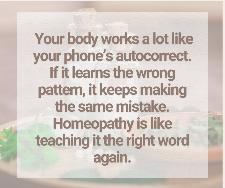 If you feel like your body has been stuck running the wrong autocorrect, homeopathy may be worth exploring. It’s not about forcing symptoms to disappear. It’s about giving your body the right message so it can do its work more effectively. Homeopathy is always matched to you as an individual, so your remedy would be chosen based on your specific patterns. If you have been feeling like your body is “autocorrecting” in the wrong direction, I would be happy to talk with you about how we might help it get back on track.
